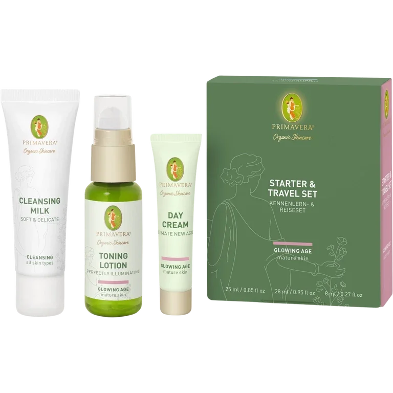 Deze set bevat een trio aan producten dat is samengesteld voor rijpe en veeleisende huidtypes: een reiniger, toner en gezichtscrème. De Glowing Age productlijn is verrijkt met kostbare kahai-olie. De formules versterken de veerkracht van de huidbarrière en -structuur, en verstevigen de teint zichtbaar. Perfect voor een weekendje weg.